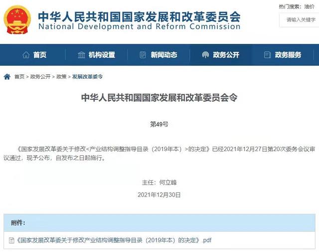 據(jù)國家發(fā)展改革委官網(wǎng)消息,《國家發(fā)展改革委關(guān)于修改<產(chǎn)業(yè)結(jié)構(gòu)調(diào)整指導(dǎo)目錄(2019年本)>的決定》已經(jīng)2021年12月27日第20次委務(wù)會議審議通過。